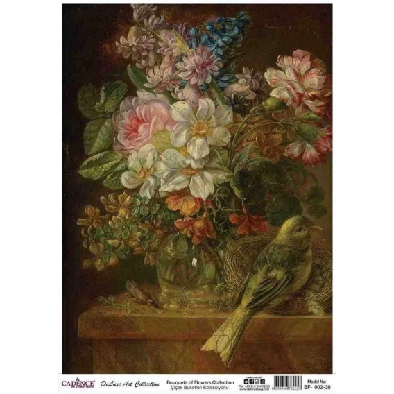 • Çiçek Buketleri koleksiyonu pirinç kağıt dekopajlar çeltik sapından yapılan ince kâğıt üzerine basılı olduğundan, dekopaj çalışmaları için kullanımı son derece kolaydır.